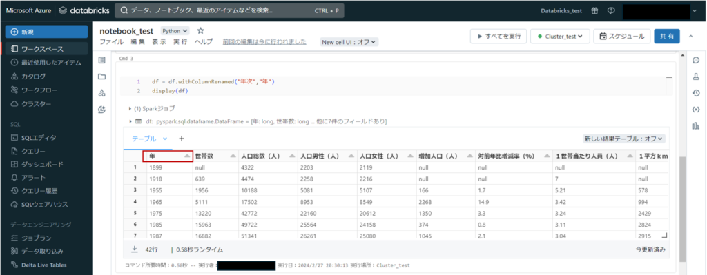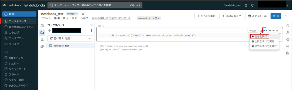 ▶ボタンをクリックするとメニューが表示され、「セルを実行」で処理が実行されます。