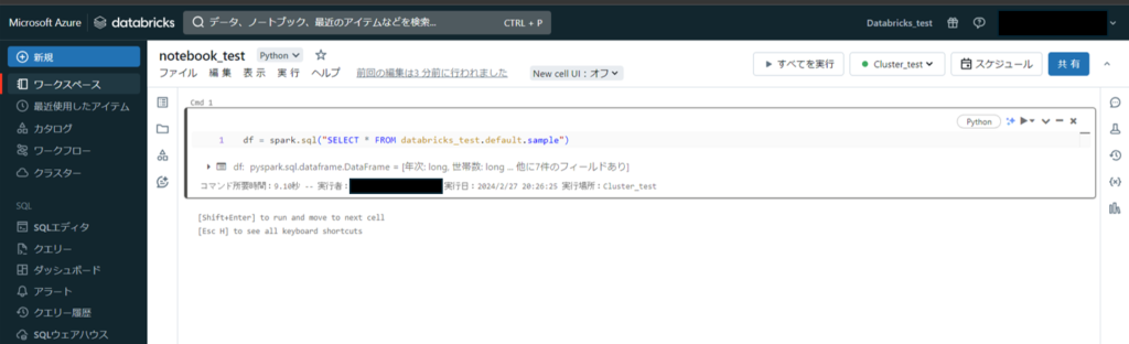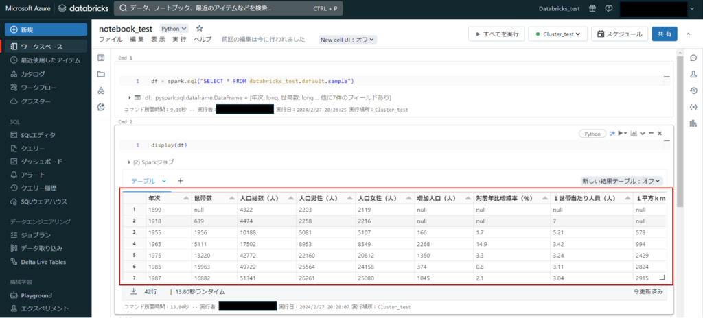 以下コードをノートブックに記載し実行すると、sampleテーブルが表示されます。
