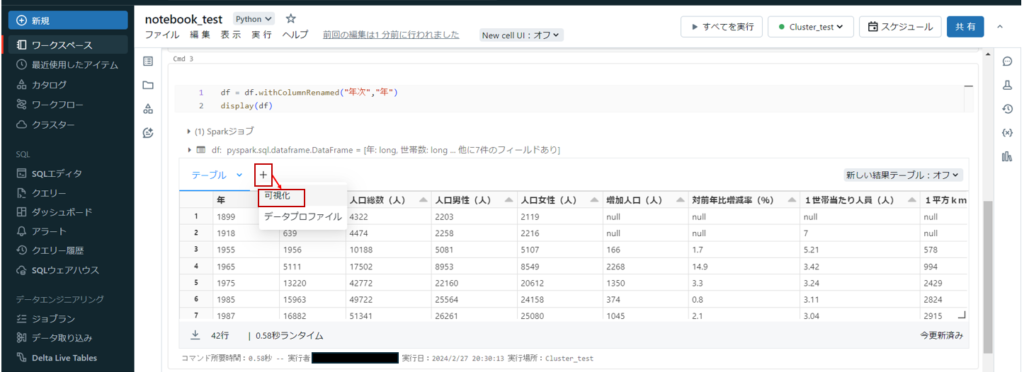 今回は、クラスター(計算リソース)作成からデータ取込・加工・可視化までの一連の流れを実行してみます。