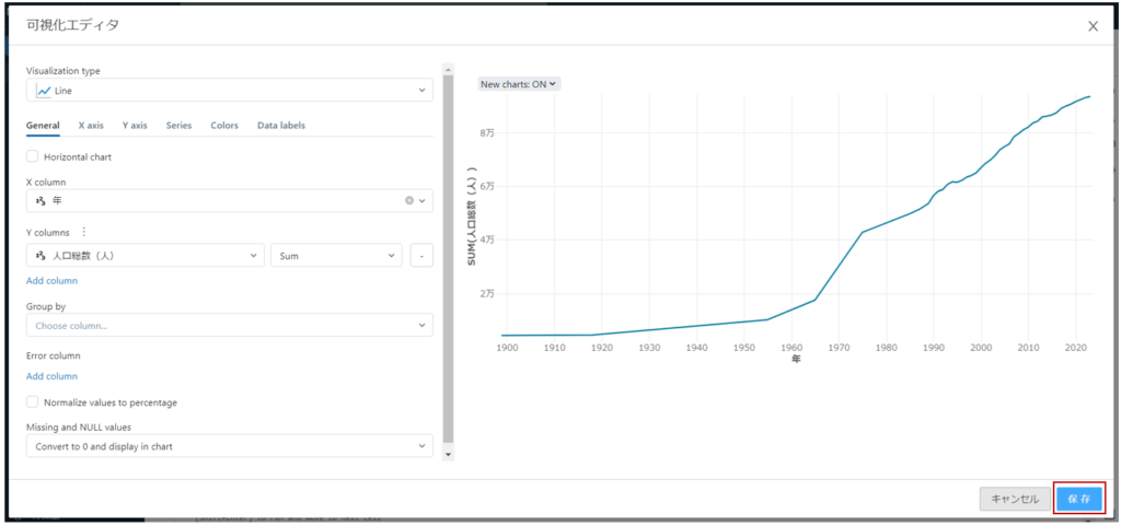 今回は、線グラフで経年での人口推移グラフを作成します。