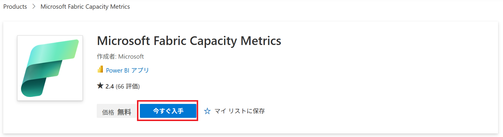 まずは、Microsoft AppSourceで「Microsoft Fabric Capacity Metrics」と検索します。