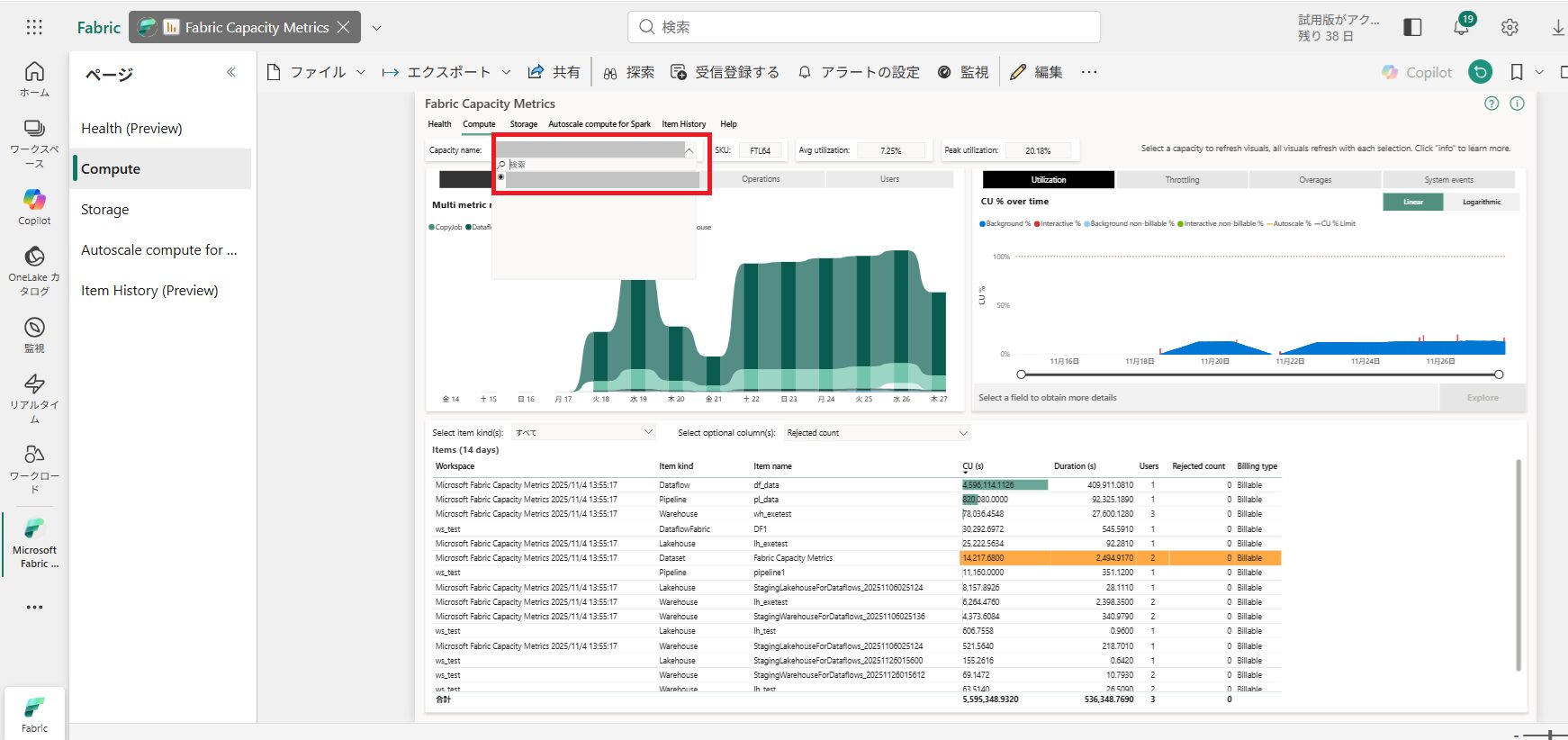 しかしマイクロソフト社は、Fabric容量の消費量を監視できる「Microsoft Fabric Capacity Metricsアプリ」を提供しています。
