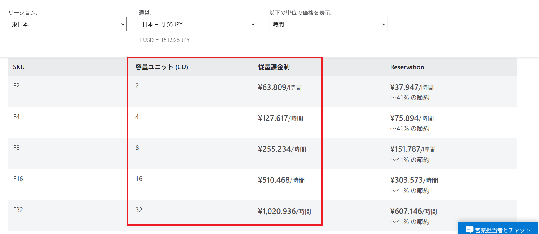 以下画像(2025年11月4日時点)を確認すると、1時間に1容量ユニット(CU)あたり約31.905円であることが分かります。