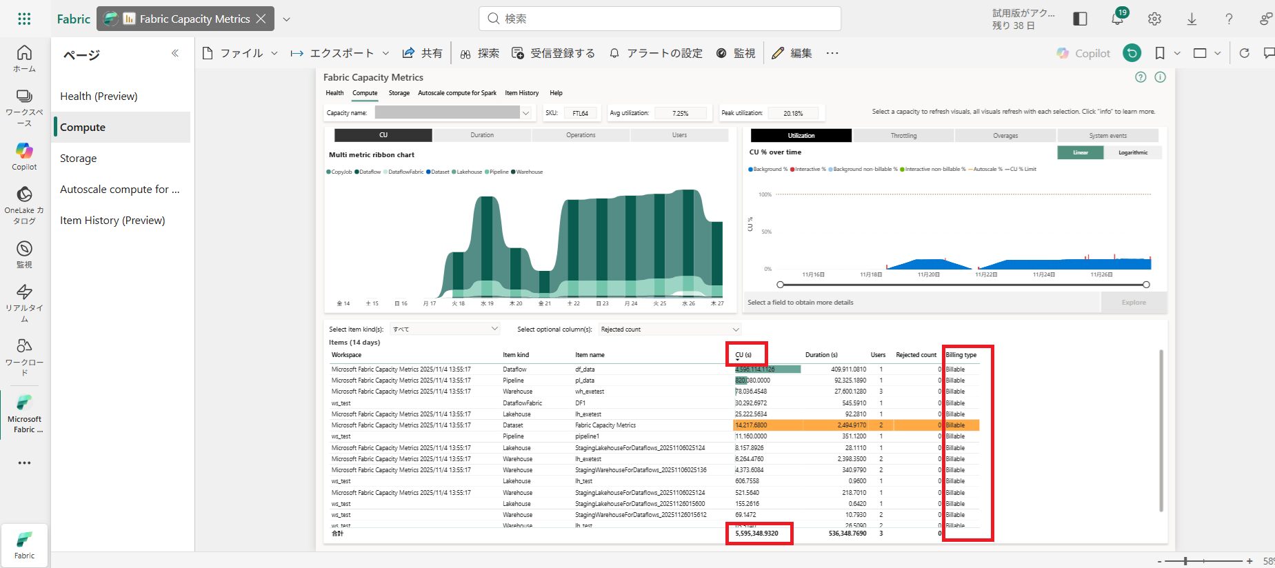 続いて、アプリの「Compute」のページから、Billing typeが「Billable(課金対象)」であるアイテムのCU(s)の合計を確認します。