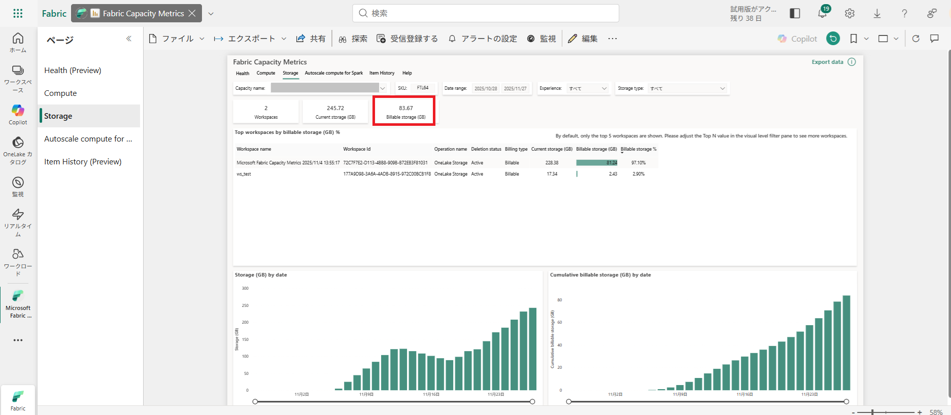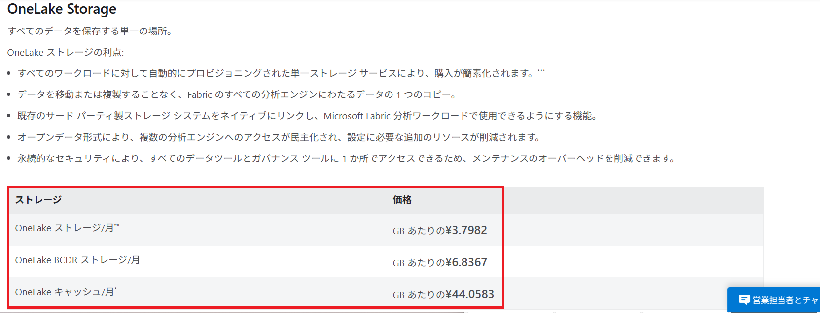 以下画像(2025年11月4日時点)を確認すると、OneLakeストレージは1カ月に1GBあたり3.7982円、OneLake BCDRストレージは6.8367円、OneLakeキャッシュは44.0583円であることが分かります。