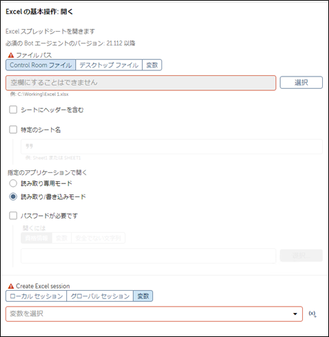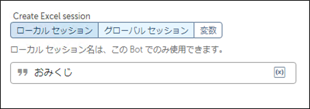 | Create Excel Session(セッション名) | ロボットの処理内において、どのExcelファイル上で行う処理なのかを判別するための名前を入力する | ローカル:現在のロボットに対応 グローバル:すべてのロボットに対応 変数:変数名 |