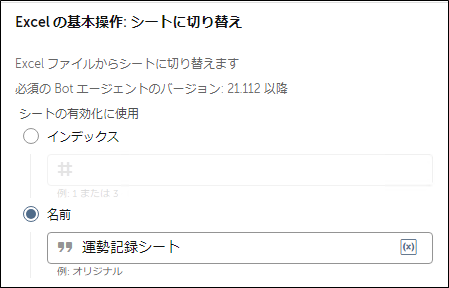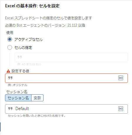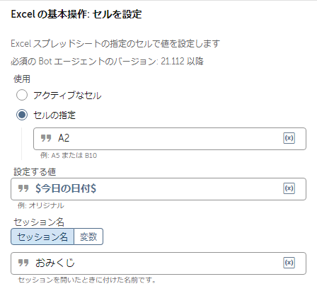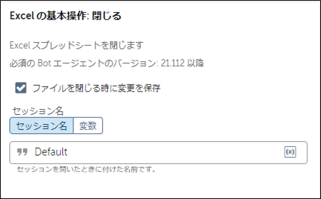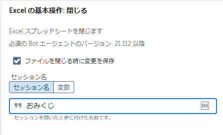 | セッション名 | ロボットの処理内において、どのExcelファイル上で行う処理なのかを判別するための名前を入力する |