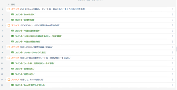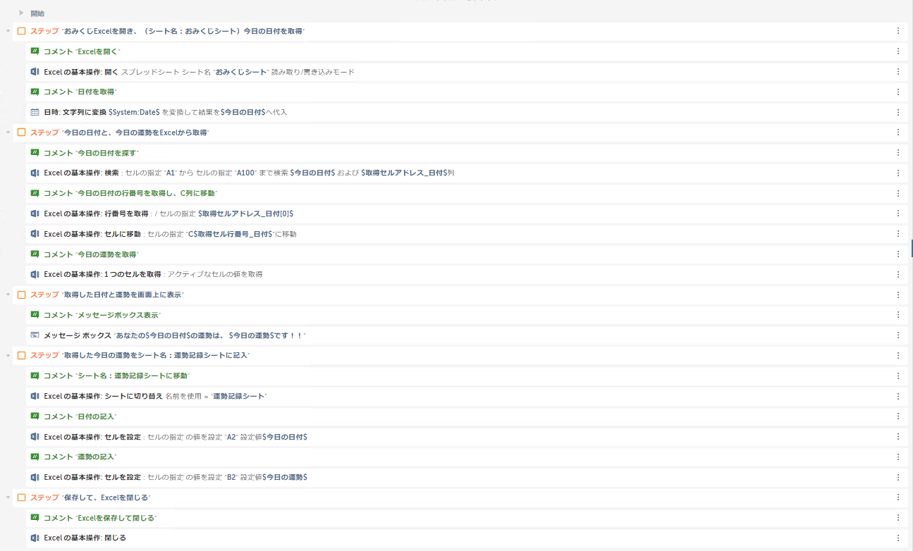 第1ステップは、おみくじExcelを開き(シート名:おみくじシート)、今日の日付を取得する処理です。