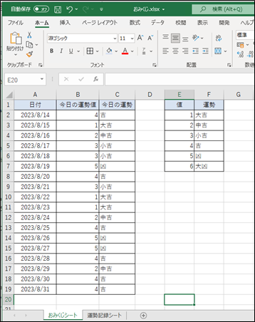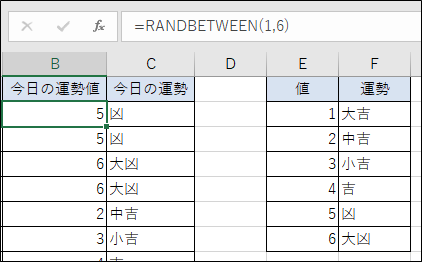 出力された数字に応じて今日の運勢がC列に表示されます。