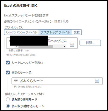 また、おみくじシートから運勢の情報を取得するため、シート名おみくじシートを開くように設定します。