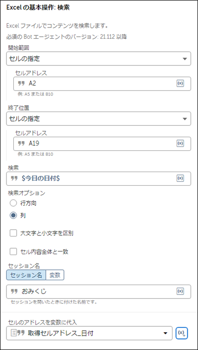 検索ワードは先ほど取得した今日の日付の変数に格納した値を使用し、検索して見つかったセルアドレスを変数に格納します。