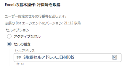 | 行番号を取得 | 現在のセルまたは任意のセル位置を指定したセルの行番号を取得する | 【例】A1であれば1が文字列変数として取得される |