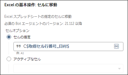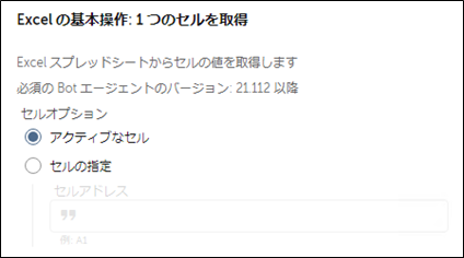 | 1つのセルを取得 | 現在のセルまたは任意のセル位置を指定したセルの値(【例】A1)を取得する | 文字列変数として取得 |