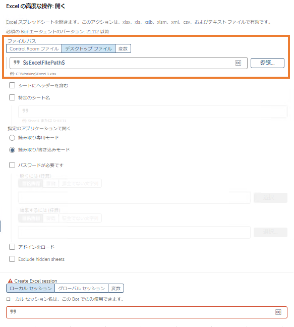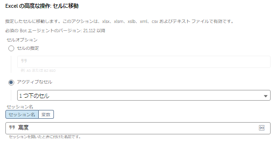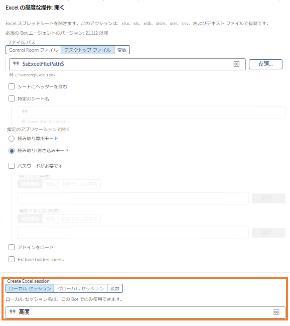 これはRPAでExcelを操作する際に使われるセッションのため、Excelの高度な操作で同じファイルを操作する際には同じセッション名をアクション内に設定することで、複数のExcelファイルを開いている場合でも操作対象のファイルをRPAが認識できるようになります。