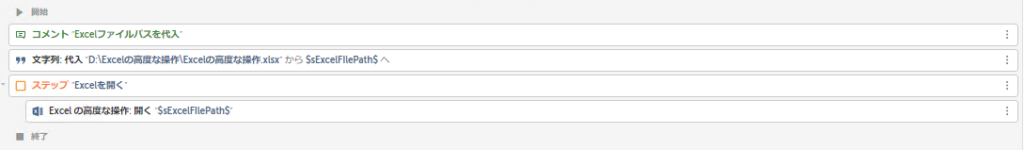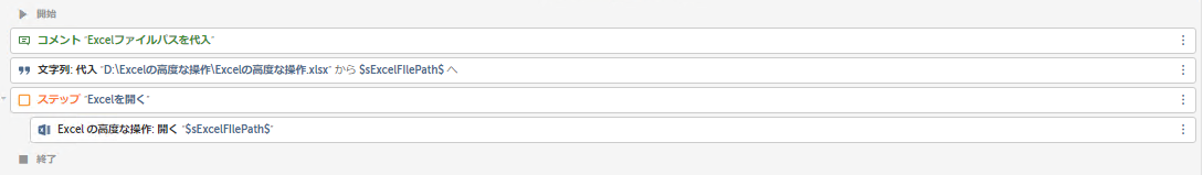 まず、「Excelの高度な操作:開く」アクションで、開きたいExcelのファイルパスを指定します。