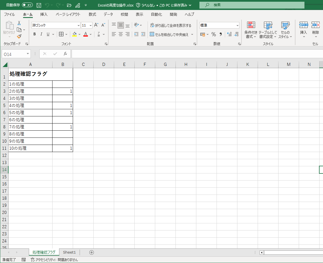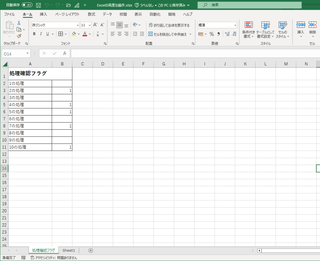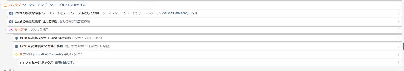 シートを有効化したら、次に、シートに記載されている「処理確認フラグ」の表をデータテーブル変数として取得してみます。