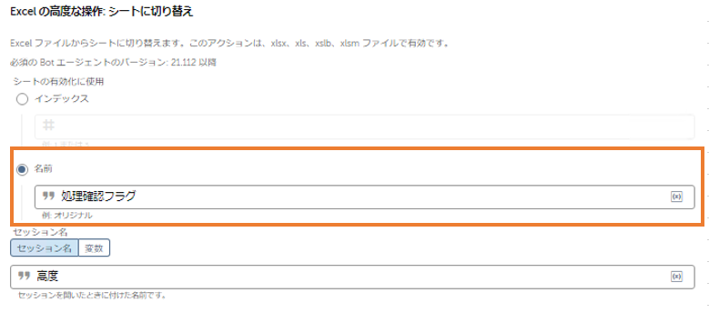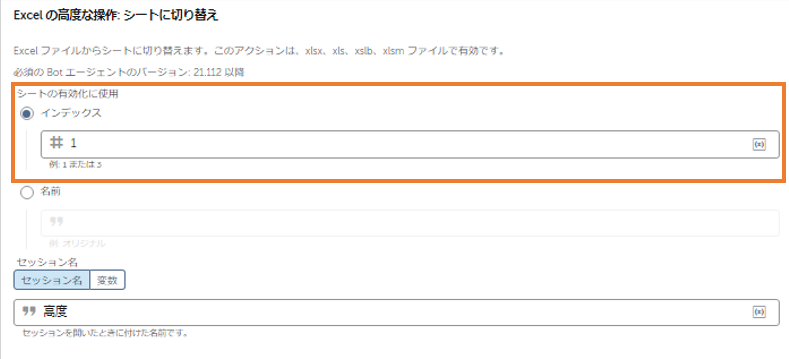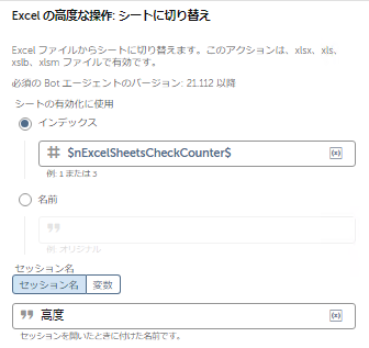 次にループ内の「Excelの高度な操作:シートに切り替え」で、現在のループ数のインデックスのシートを有効化するように設定します。