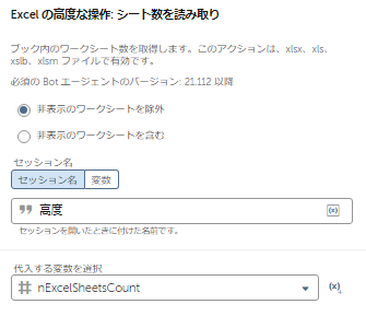 まず、「Excelの高度な操作:シート数を読み取り」アクションで、数字変数に結果を代入します。