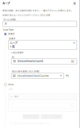 次にループアクションを使い、反復子に先ほど取得したシート数の数字変数を設定します。
