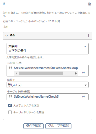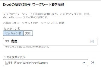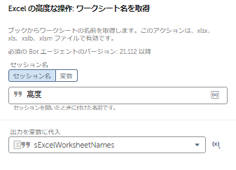 ループアクションの中に、「Excelの高度な操作:ワークシート名を取得」アクションを配置し、ワークシート名を文字列変数に代入します。