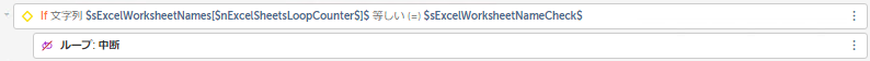 次にIF文を配置し、取得したワークシート名があらかじめ代入しておいた目当てのワークシート名の文字列変数と一致した場合、ループを中断する、と条件づけます。
