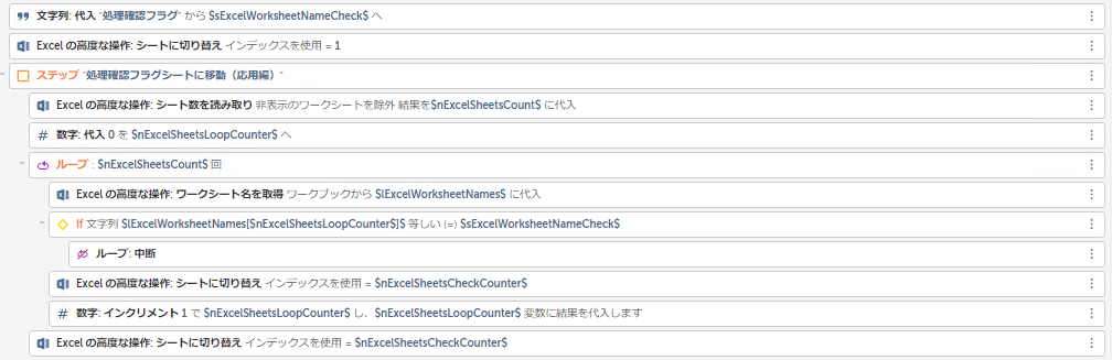 最後に、一致するシート名を見つけてループを抜けた後のループ数をインデックスに指定し、「Excelの高度な操作:シートに切り替え」で目的のシートへ移動できるよう設定します。