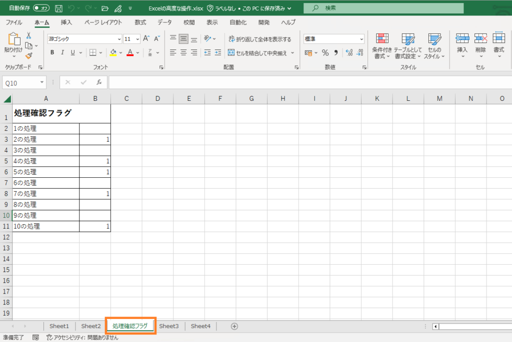今回は「処理確認フラグ」というシートを有効化したいので、インデックスを「1」に設定しました。