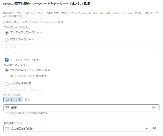 「Excelの高度な操作:ワークシートをデータテーブルとして取得」アクションで、セッション名を設定し、「値を変数に代入」ではテーブル変数を選択します。