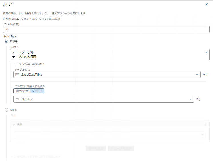 Excelの処理確認フラグをテーブル変数として取得できたら、ループアクションの反復子で「データテーブル テーブルの各行用」を選択し、先ほどのテーブル変数を設定します。