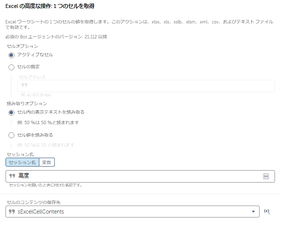 Excelから取得したテーブル変数の各行文のループ処理内に、「Excelの高度な操作:1つのセルを取得」アクションにてアクティブなセルを取得します。