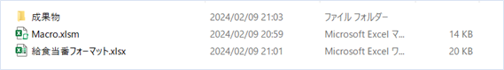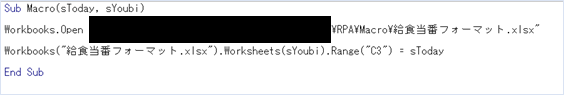 「Macro」というマクロが実行されると、「給食当番フォーマット.xlsx」を開き、引数の曜日のシート名のC3セルに日付を入力する指示になっています。