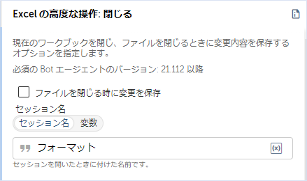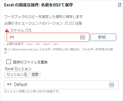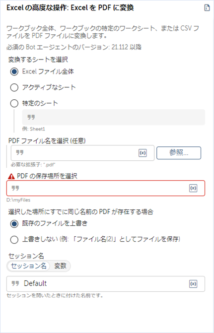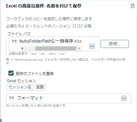 | セッション名 | どのExcelファイル上で行う処理なのか判別するための名前を入力する | - |