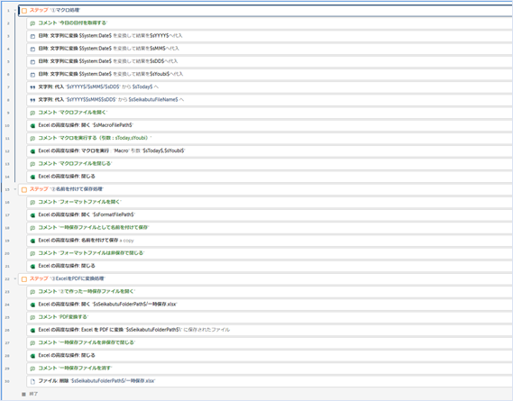 最後に、作成した「一時保存.xlsx」をPDF変換する処理を作成します。