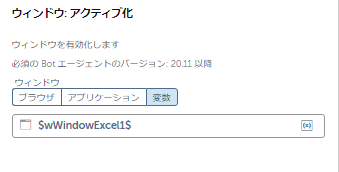 今回はアクティブ化するウィンドウに対してウィンドウ変数をあらかじめ作成しておき、それを「アクティブ化アクション」で指定します。