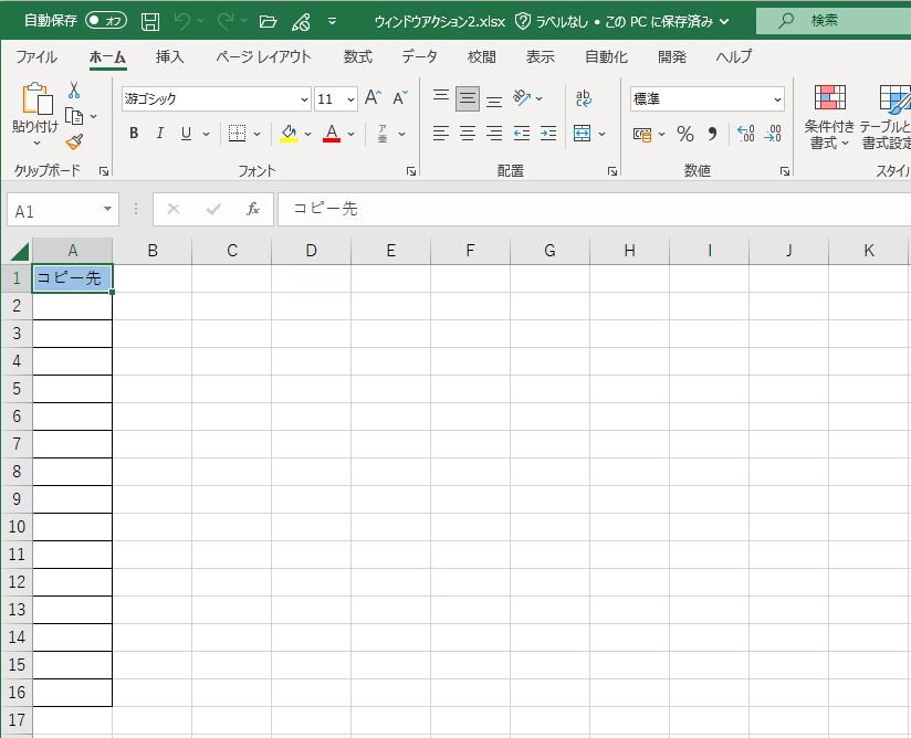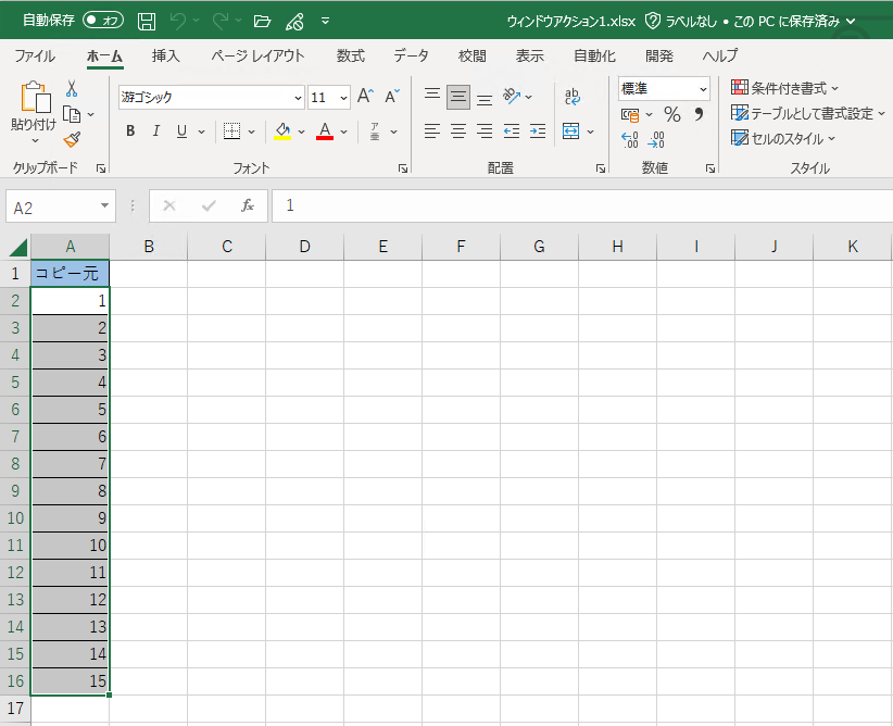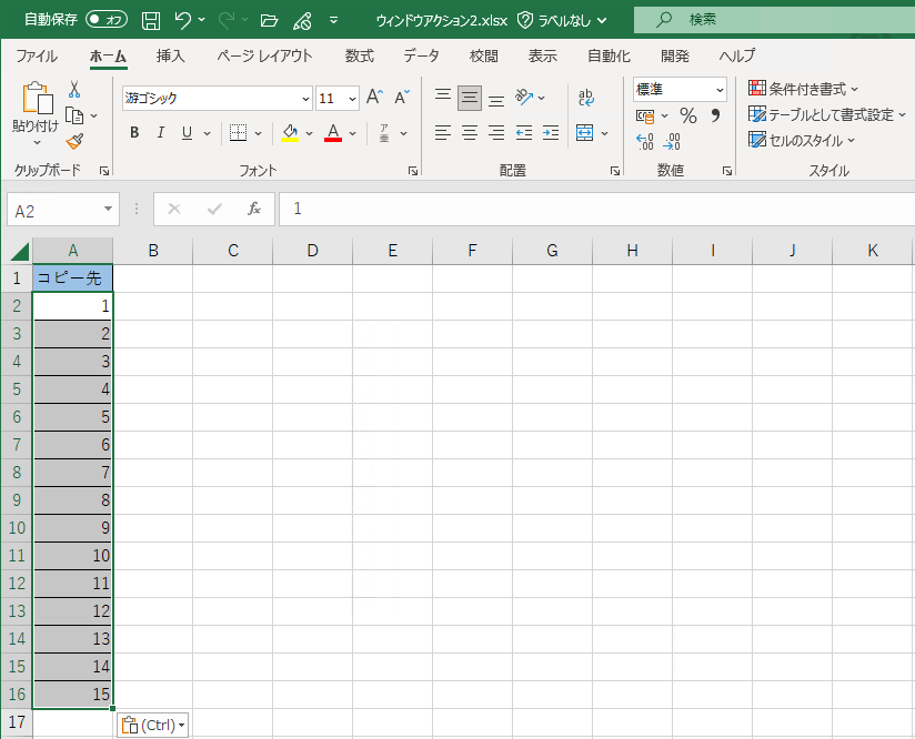 A2~A16をコピーして、「ウィンドウアクション2.xlsx」のA2~A16セルへコピーします。