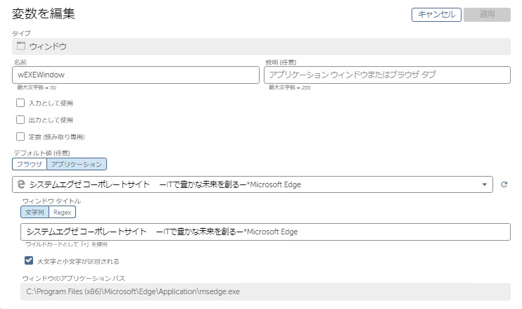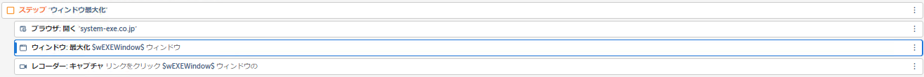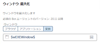サイトを開いた後、「ウィンドウ:最大化」アクションで、あらかじめ作成したウィンドウ変数を指定し、ウィンドウを最大化します。