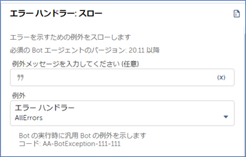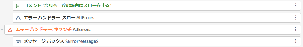 例えば、Webサイトからダウンロードした請求書の金額と、別で集計した金額マスタの合計金額を照らし合わせる処理があった場合に、金額が一致していない場合は、「スロー」を使って例外処理を行うといったエラーハンドリングが可能です。