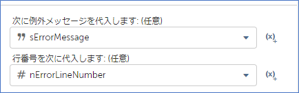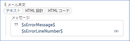 メールの本文内に、「キャッチ」内で取得したエラーメッセージとエラー行番号の変数を指定します。