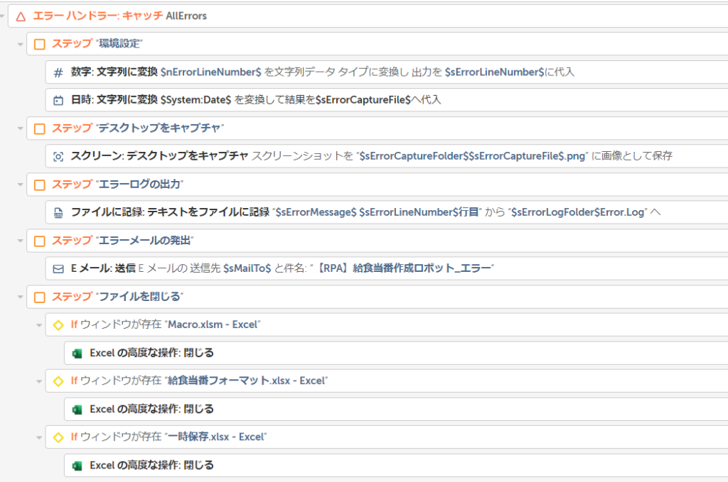 また、エラー分岐条件や、エラー発生時に行いたい処理を業務に合わせて実装することも可能です。