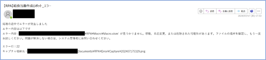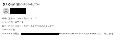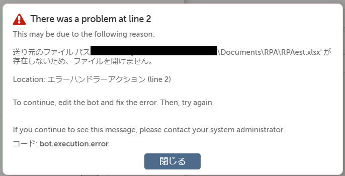 エラー後に画面を閉じずに別のRPAを動かしたり、同じRPAを再度実行したりすると、画面の誤認識等、後続の処理に影響が出る恐れがあります。