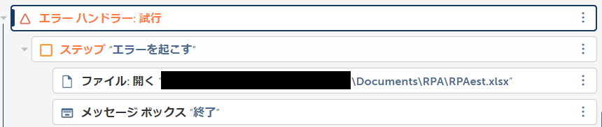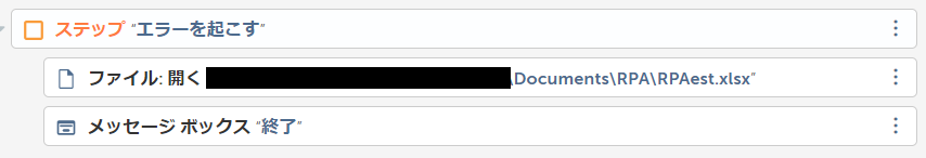 開く対象のファイル名が「RPAest.xlsx」と指定されていますが、該当のファイルが存在しないため、エラーを吐き出す仕組みとなっています。