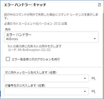 「キャッチ」内でエラーが発生した場合に、エラーとして扱うかを選択