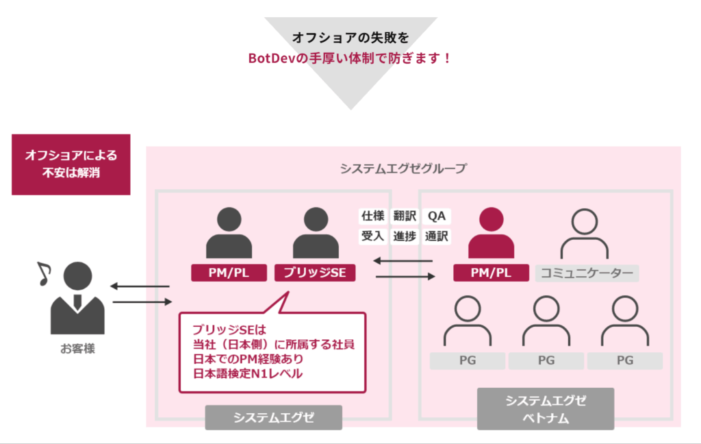 システムエグゼのBotDevは、Borderless OneTeam Developmentの略称で、日本国内に常駐しているPMとブリッジSE、ベトナム現地のコミュニケーターの三層で品質と納期を担保する体制が特長です。