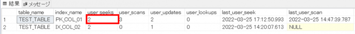 非クラスターインデックスのuser_seeksは1だけで、クラスターインデックスのuser_scansが2になっています。