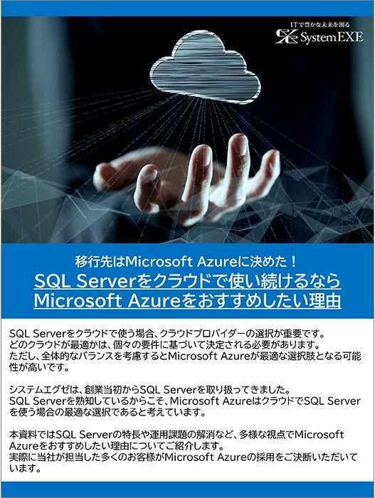 SQL Serverを熟知しているからこそ、システムエグゼはMicrosoft AzureはクラウドでSQL Serverを使う場合の最適な選択であると考えています。 本資料では、SQL Serverの特長や運用課題の解消など、多様な視点でMicrosoft Azureをおすすめしたい理由についてご紹介します。 ■本資料の対象ユーザー ・SQL Serverの移行をご検討中の方 ・Azureへの移行を検討中の方 ■本資料からわかること ・Azureで利用可能なSQL Serverサービスの概要と他クラウドとの比較 ・Azure SQL Managed InstanceとAzure SQL Databaseの違い