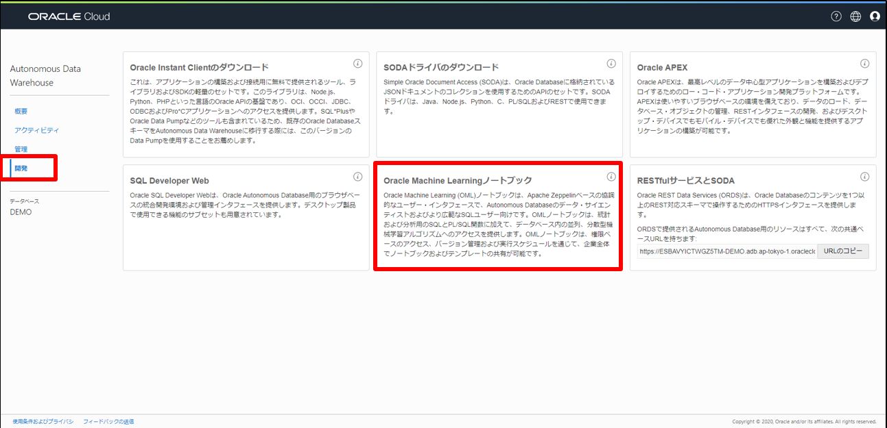 クライアントPC の SQL Developer からでも機械学習のストアドは実行できますが、せっかくなので ADW ならではの「Oracle Machine Learningノートブック」を使っていきます。