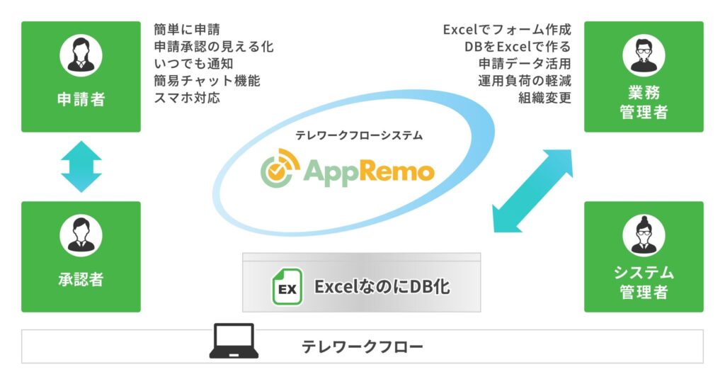 テレワークフロー「AppRemo」は、申請・承認業務機能を中心に構成されたワークフローシステムです。申請者や承認者はどんな場所でも使いやすく設計されており、業務管理者やシステム管理者の運用・管理負荷を下げることにも配慮されています。