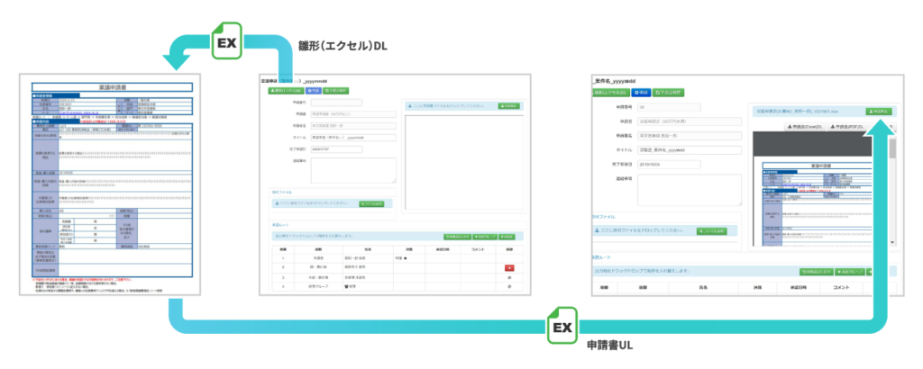 Web申請フォームではなく、Excelファイルでそのまま申請できます。専門知識不要で使え、現在のExcel申請書からの移行も簡単です。 - 特長5 Excelなのにデータベース化できる