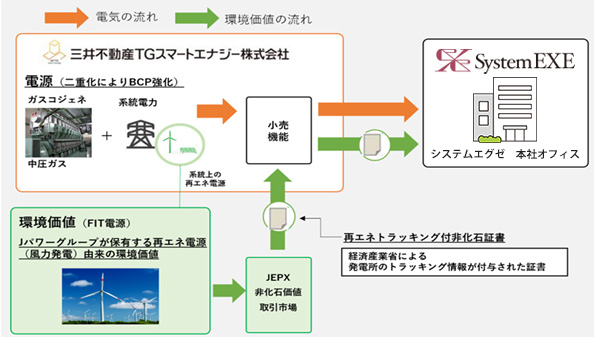 三井不動産TGスマートエナジー社が提供する実質再エネメニューで、通常の電気の他に 「非化石証書」を同社が調達し、システムエグゼが購入します。