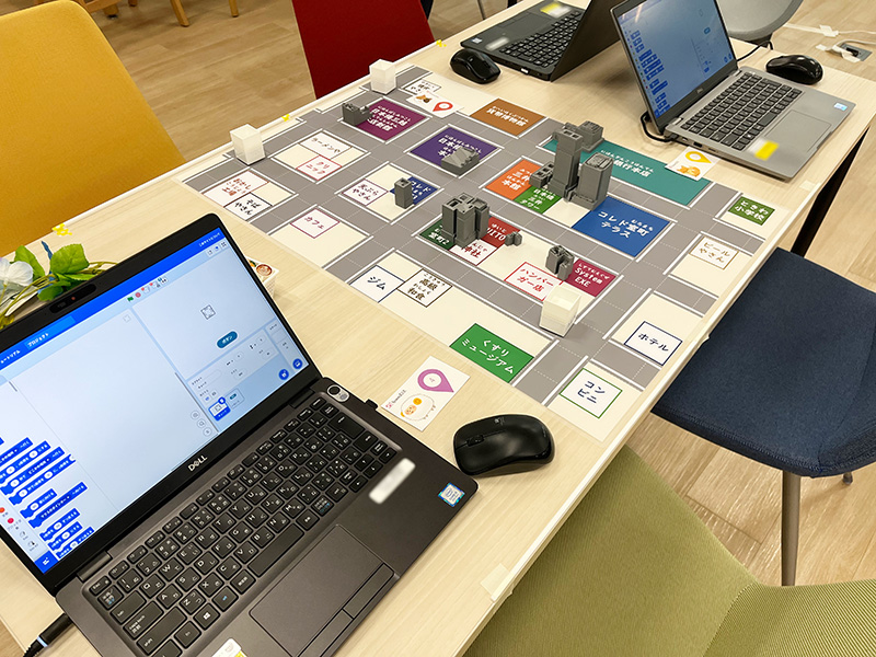冒頭で簡単なプログラミングの練習を行った後、ロボットが日本橋界隈の巨大な立体地図の中で、お客さまから依頼された注文通りにモノを配達するというミッションに挑戦してもらいました。